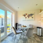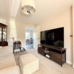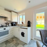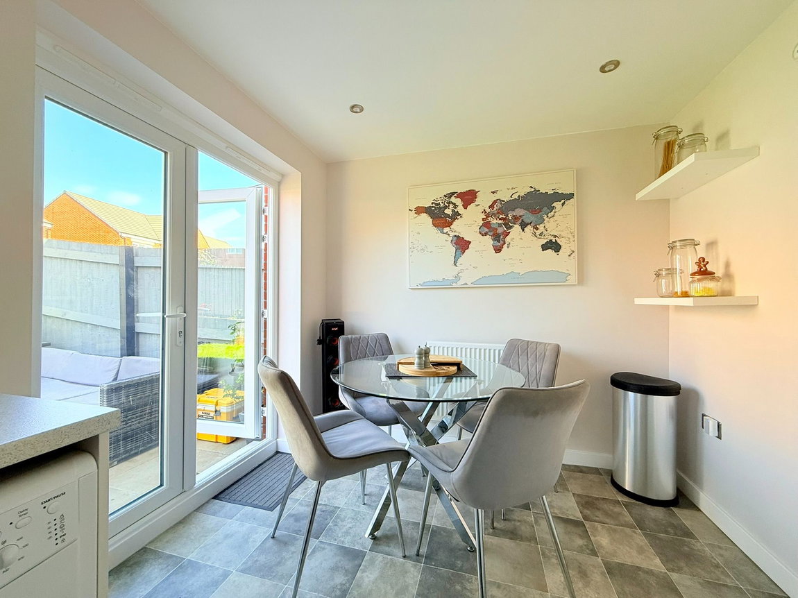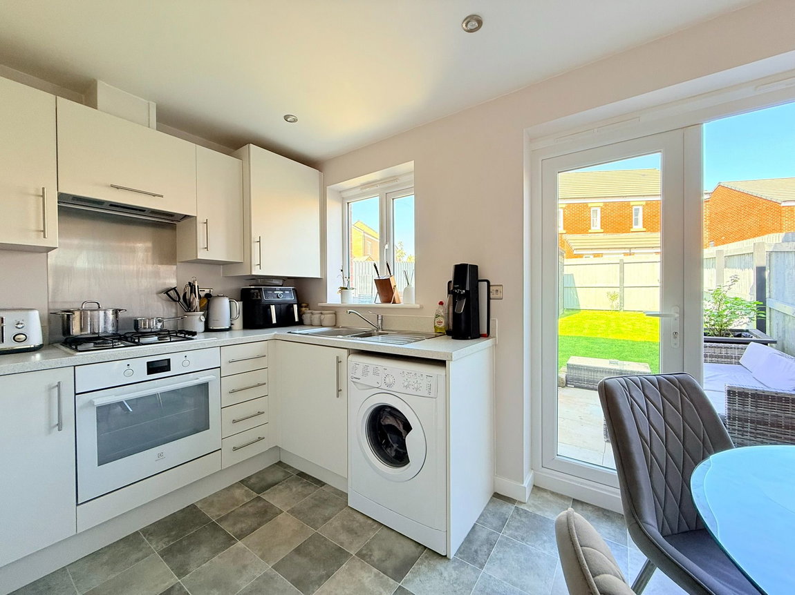 The dining kitchen, positioned at the rear, is both stylish and functional. It boasts a range of contemporary cream gloss wall and base units, complemented by matching worktops and upstands. Integrated appliances include a hob, oven, and extractor, with space provided for a fridge freezer, dishwasher and a washing machine.  A wall unit neatly houses the combi boiler. There is ample room for a dining table, offering delightful views of the garden through French patio doors that provide direct access outside.