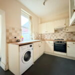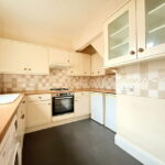 The kitchen is equipped with a range of wall and base units, complemented by worktops and a tiled splashback. It includes an integrated oven and hob with an extractor, a sink and drainer, and under-counter space for a fridge, freezer and washing machine.