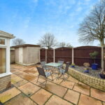 The low-maintenance garden is primarily laid with sandstone paving slabs, featuring a raised border for plants and shrubs, a practical storage shed, and convenient rear access – providing a safe and easy-to-manage outdoor area for the family.