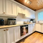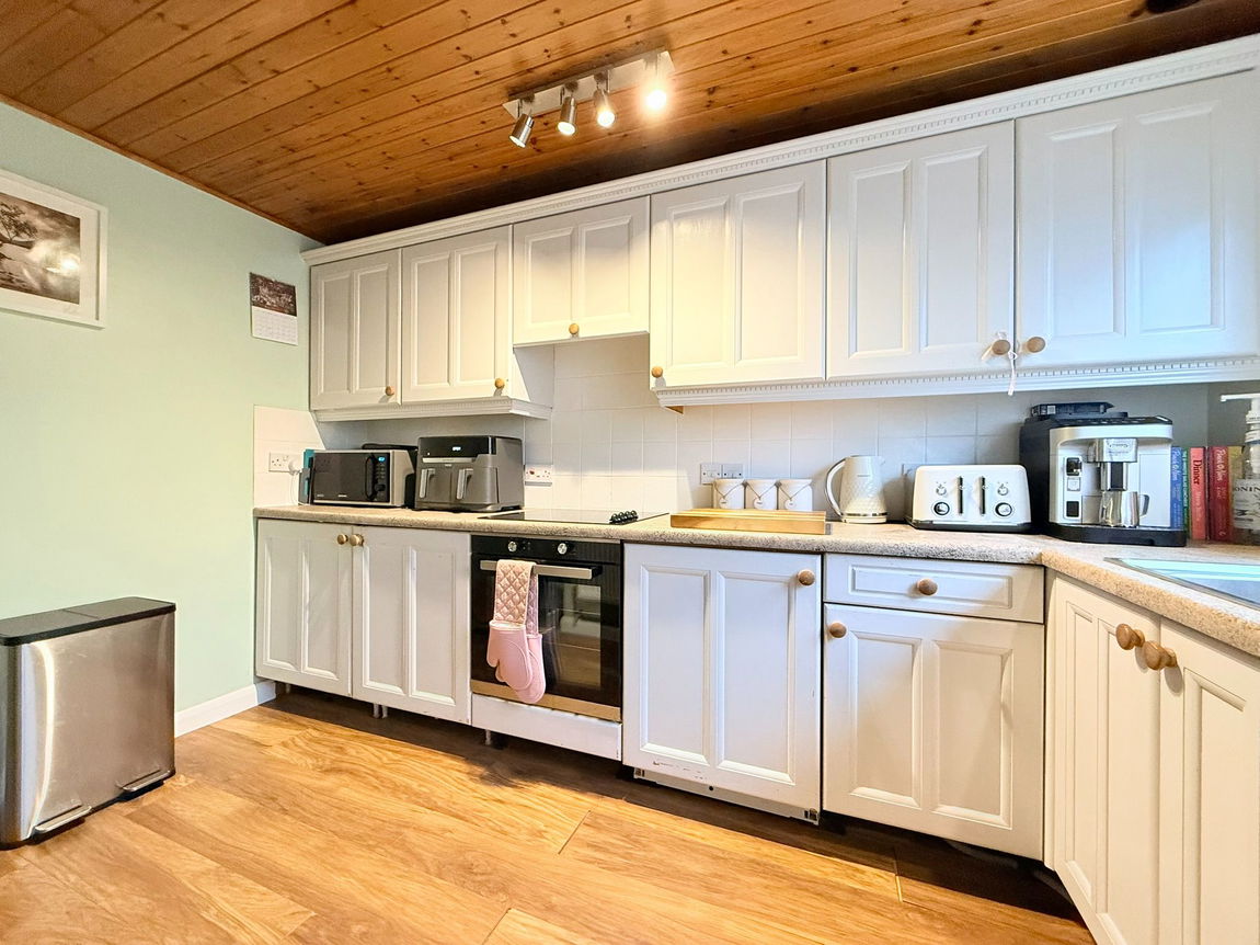 The front-facing kitchen is thoughtfully designed with a range of wall and base units, complementing worktops, and stylish tiled splashbacks. It comes equipped with an integrated electric hob and oven with an extractor over, an integrated dishwasher, fridge, and freezer, a sink and drainer, and under-counter space for a washing machine. There is also room for a small dining table.