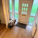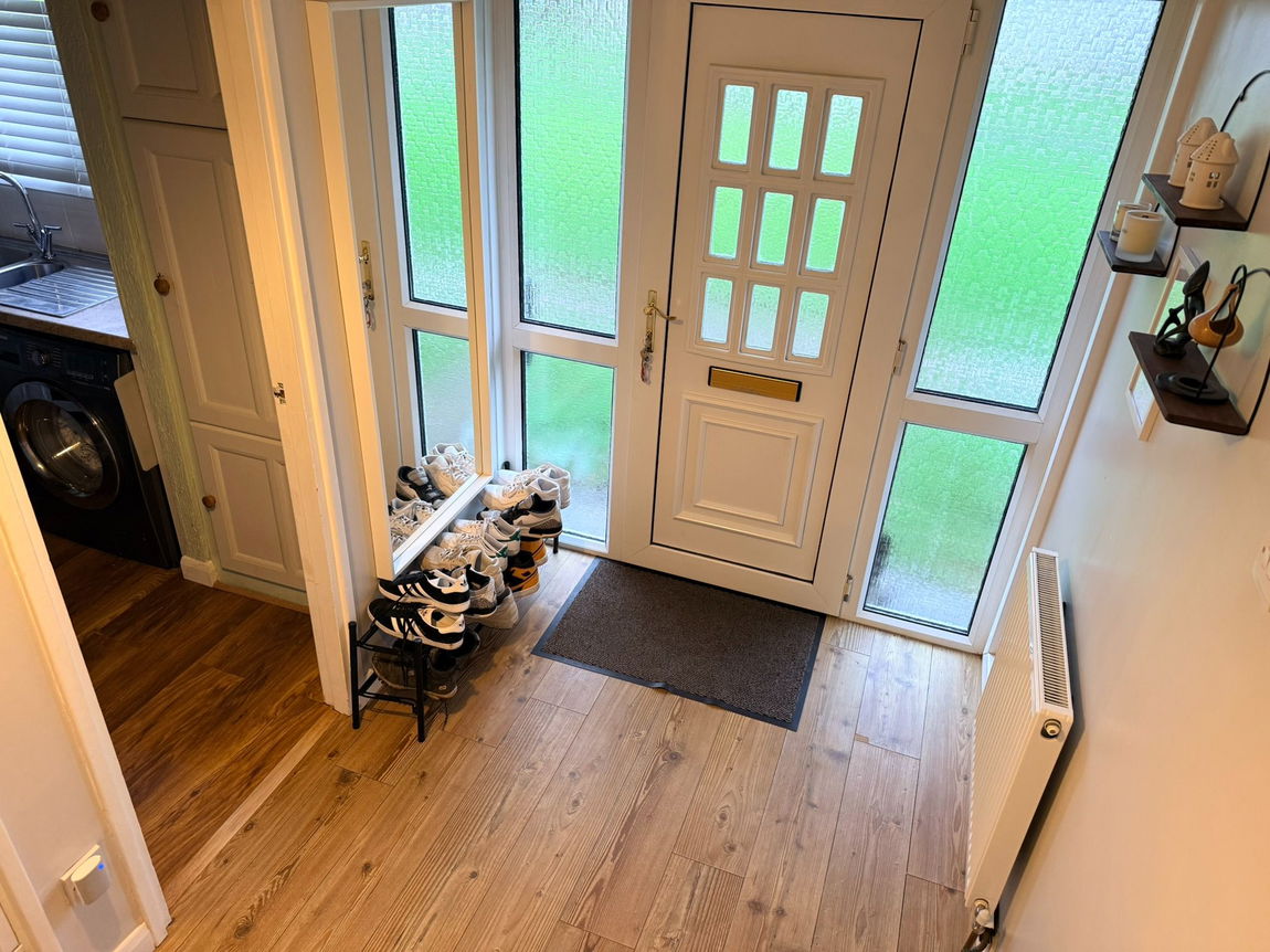 Accessed from an open grassed area, the welcoming front door leads into a practical hallway, providing access to the stairs, kitchen, a spacious living room, and a useful cloaks cupboard – ideal for keeping family life organised.