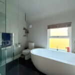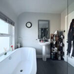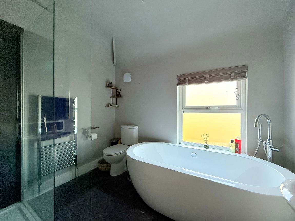 The family bathroom is four piece with a walk in shower, free standing bath, basin and toilet, plus a towel radiator.