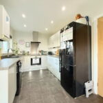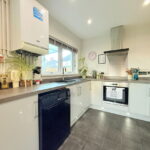 The modern dining kitchen is to the rear of the home and features a range of white gloss wall and base units with a complementing worktop, an integrated oven, hob and extractor and space for a fridge freezer and a dishwasher.