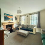 Inside, the hallway leads to the living room and also has the stairs to the first floor. The living is well lit by two front windows and has a log burning stove set into an exposed brick fireplace.