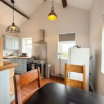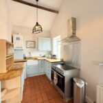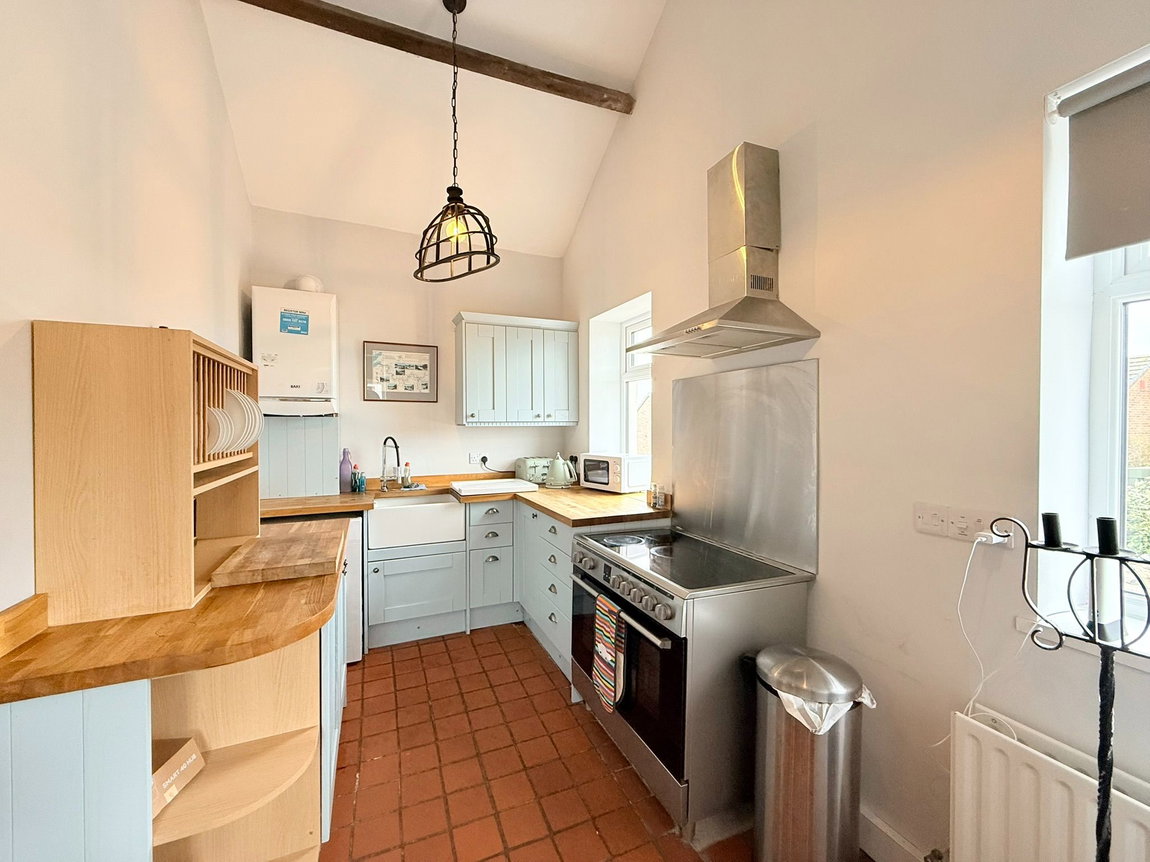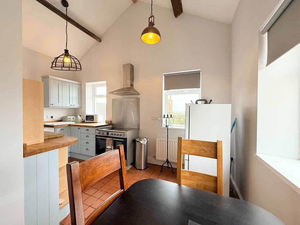 The dining and kitchen area is both stylish and functional, equipped with a shaker-style kitchen, a Belfast sink with porcelain drainer and solid wood worktops. There is ample space for a range-style cooker, a fridge freezer and a washing machine.