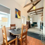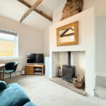 A step and ramp lead to the front door, opening into a fabulous open-plan living area. This captivating space boasts vaulted ceilings and original beams, creating an airy and characterful atmosphere. The well-defined lounge area features a wonderful fireplace with a cosy log-burning stove, perfect for cooler evenings.